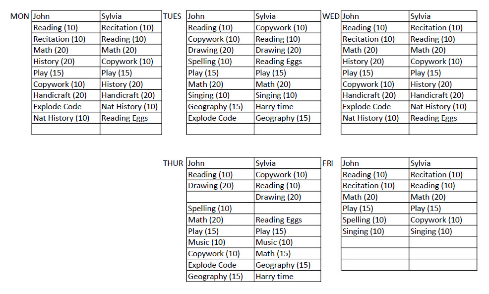 This year, I have created a timetable to schedule the work for a 1st grader and 3rd grader, both of whom will require all of their lessons read to them. Sometimes the times do not line up 100% correctly and sometimes it might not be clear how I can be in 2 places at once (hahaha!) but my husband will be helping out with the first lesson of the day. Here is my initial attempt to make this work . . . it will likely be tweaked as we put it into action. Some of the subjects do not appear on the timetable because we do them at morning time or another time, so be sure to read below to see how we fit those into our day.