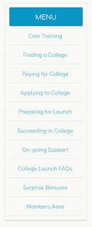 As you can see from the course menu above, this course includes 6 training sections: Core Training, Finding a College, Paying for College, Applying to College, Preparing for Launch, and Succeeding in College as well as a few bonuses.
