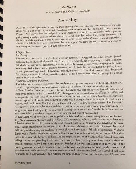 | Sample Answer key page for Animal Farm |