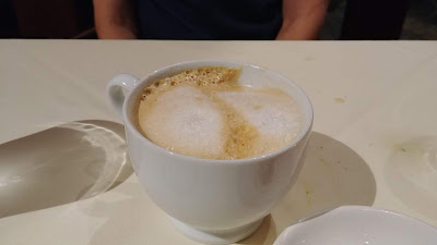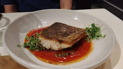 SP's meal: Red Fish A la Plancha (Texas Redfish Seared A la Plancha-Style, Sauce Livornese, Asparagus Coins, Capers, Black Olive Oil). Redfish is also known as red drum or channel bass and it was on a lot of menus in Texas. He said it was good.