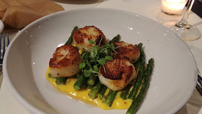 I chose Diver Scallops (Atlantic Diver Scallops Seared A la Plancha-Style, Corn Pudding, Winter Harvest Succotash). Since there was garlic in the succotash, they substituted asparagus, which was fine with me since I like asparagus better. I thought this was just OK. The scallops were a little over cooked, they just weren't as melt in your mouth like as others I've eaten. There was a lot of black pepper on the asparagus, too much for me. This was the case at another place we ate. Perhaps in TX people like their food seasoned with a lot of black pepper? For me, this wasn't a dish I'd order again.