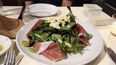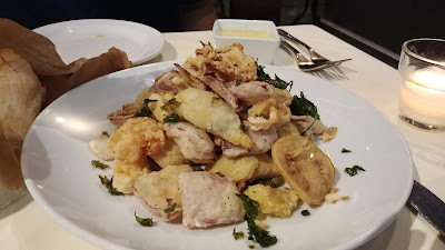 Slices, Lemon Caper Butter Sauce). This was OK. We didn't eat the onion chunks. The artichokes were my favorite. I thought the squid was unchewable, way too tough. I had to spit out the piece I took. SP ate all the squid. He agreed it was tough but his teeth are chompier than mine so he didn't have the chewing issue I had (I even chew pudding and mashed potatoes, I need my food well-chewed!).