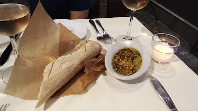 Our first dinner in San Antonio was atBella on Houston. We didn't have reservations but we were seated right away on a Monday between 5:30-6 pm. There is a nice outdoor area but since it was hot, we opted to dine inside. We started with white wine and some bread with olive oil: