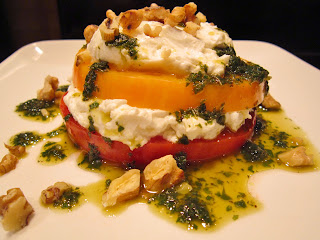 I think everyone has heard of and/or eaten Insalata Caprese, which is a salad "in the style of Capri," from the Italian region of Campania, made with fresh buffalo mozzarella, juicy red tomatoes, young fresh basil, the best olive oil, and salt and pepper. Typically, made only in the summer with the freshest most flavorful tomatoes, it is a real treat and is served as a first course with crusty bread. However, I do know some people who think it's bland and boring! Gasp! So, for those of you who think Insalata Caprese is "just okay," try this variation for "Fresh Tomato and Goat Cheese Strata with Herb Oil," by Giada de Laurentiis.