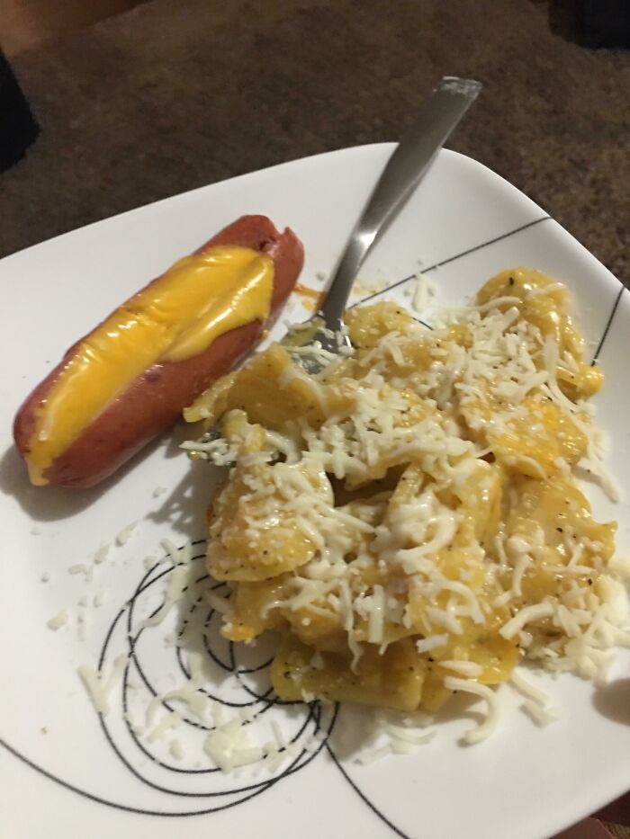 #20 4 Am Drunken Dinner. Kraft Single Stuffed Hot Dog, Boxed Au Gratin Potatoes With Preshredded Cheese. I Actually Burnt My Hand Pretty Bad Making This