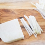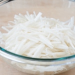 Clean the radish by scrubbing with a brush and/or scratching off the stubborn impurities with a small knife. Peel the skin only if necessary. Cut into matchsticks (about 1/8 to 1/4-inch thick).