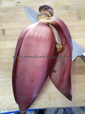 - Slice the banana blossom thinly and soak in water with some lime juice in it.