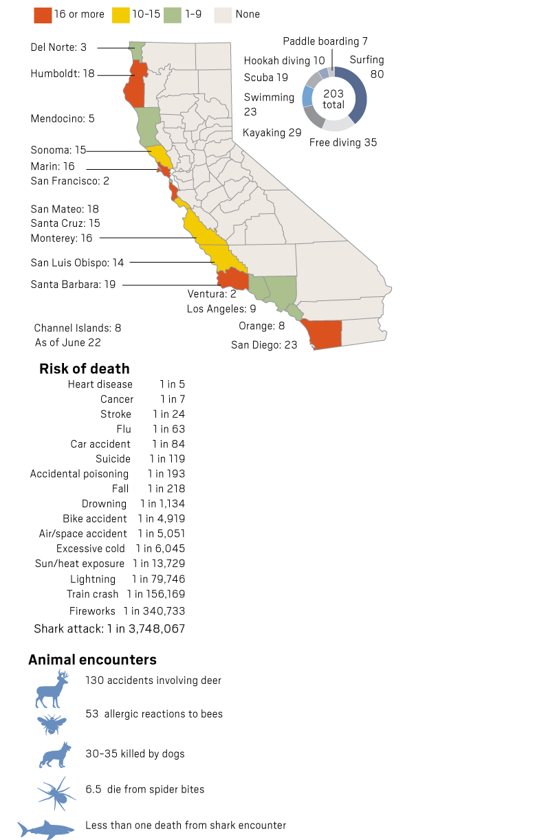 Sources: Shark Research Committee, NOAA, CSU Long Beach Shark Lab, National Geographic, California Department of Fish and Wildlife, Shark Research Committee, Discovery